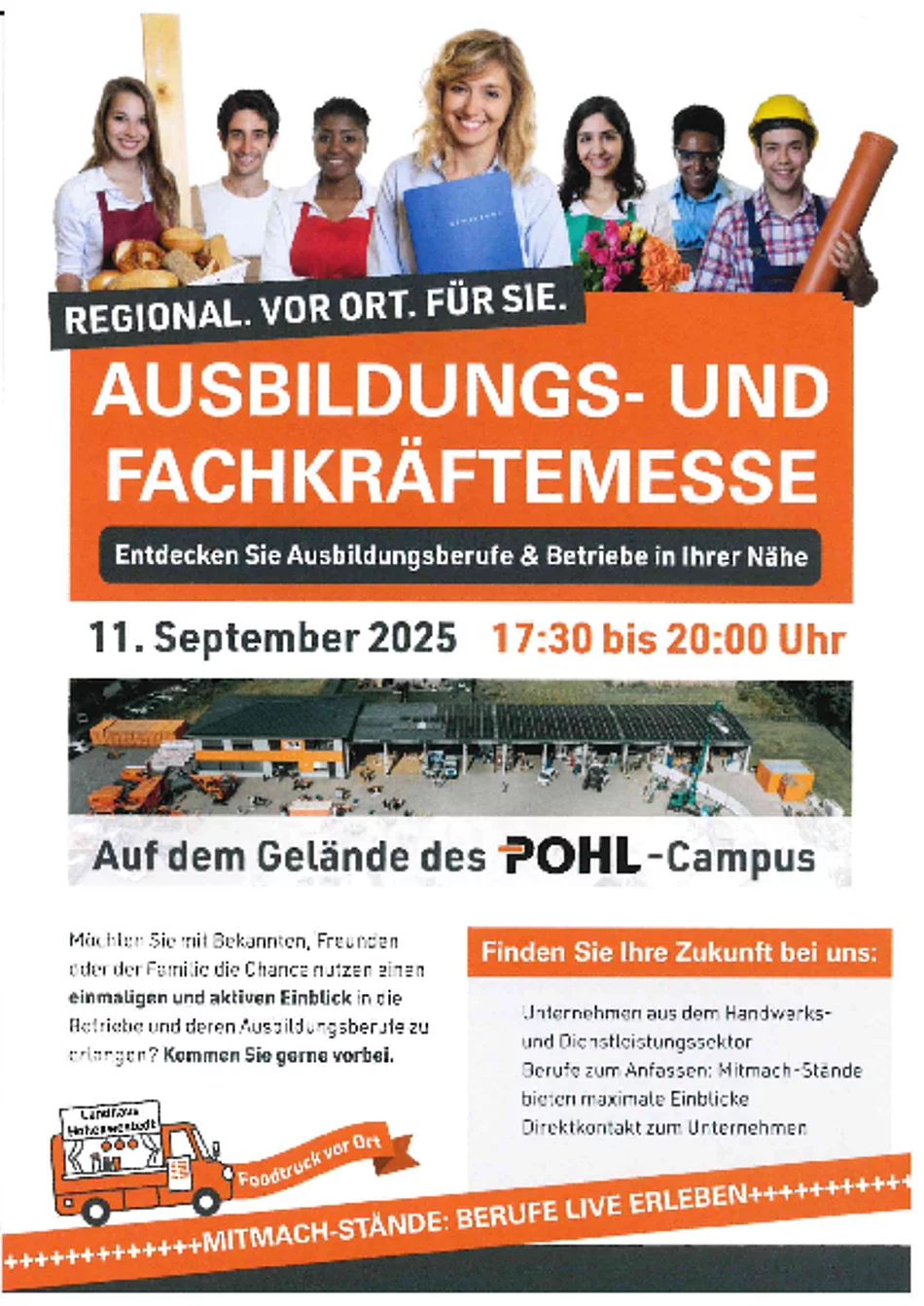 Die Ausbildungs- und Fachkräftemesse findet am 11. September 2025 von 17:30 bis 20:00 Uhr auf dem Gelände des POHL-Campus statt.