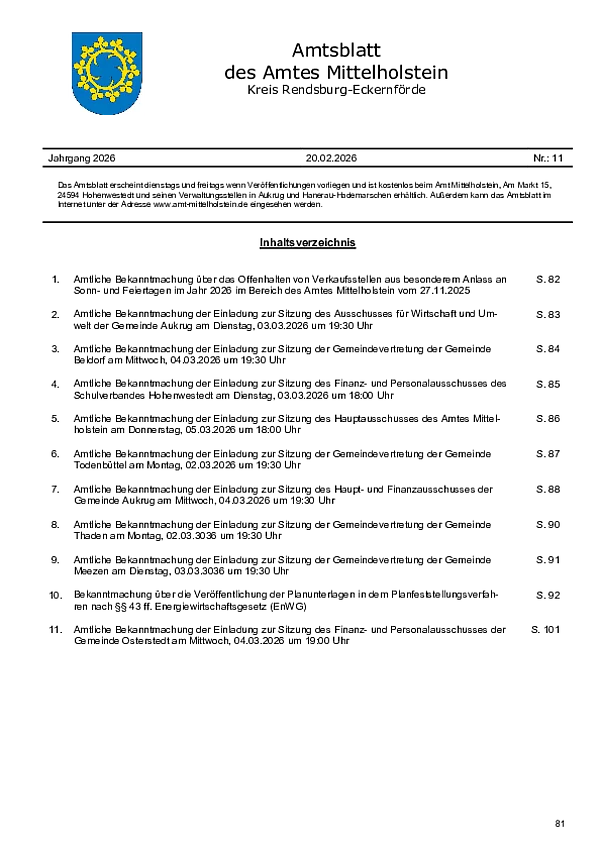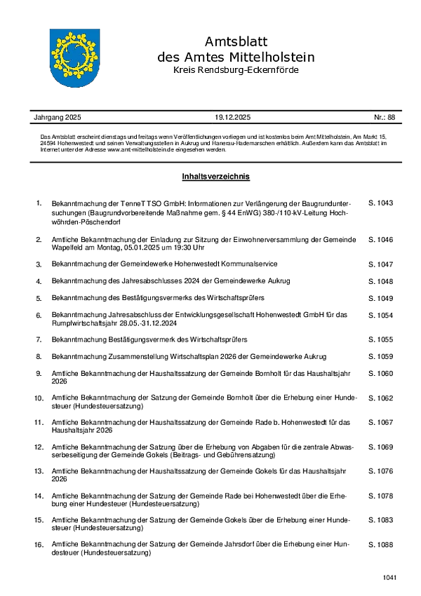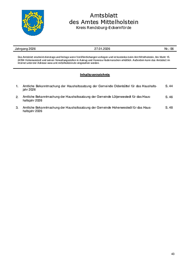 Das Amtsblatt des Amtes Mittelholstein ist gemäß Hauptsatzung des Amtes das offizielle amtliche Bekanntmachungsblatt.